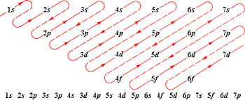 Nomor atom dijabarkan menjadi pangkat konfigurasi elektron berdasarkan urutan di gambar, dengan pangkat s maksimum 2, pangkat p maksimum 6, pangkat d maksimum 10, dan pangkat p maksimum 14.