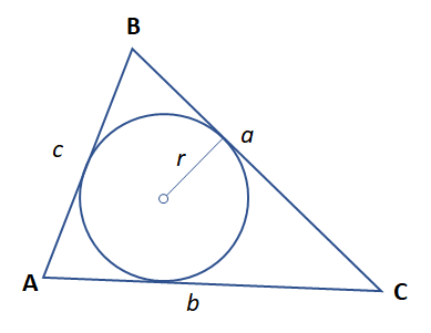 Jika panjang AB = 3 cm, panjang AC = 4 cm, panjang BC = 5 cm, maka hitunglah panjang jari-jari lingkaran dalam segitiga adalah …