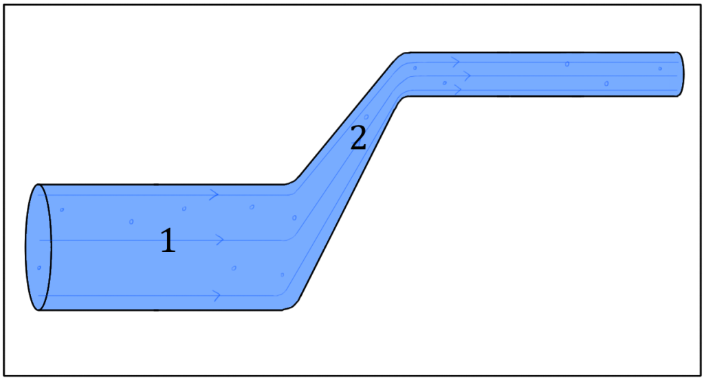 Air dialirkan melalui pipa dengan titik 1 diketahui dari pengukuran kecepatan air v1 = 4 m/s dan tekanannya P1 = 12000 Pa. Pada titik 2, pipa memiliki ketinggian 1 meter lebih tinggi dari titik 1 dan mengalir dengan kecepatan v2 = 0,5 m/s. Dengan menggunakan hukum bernoulli berapa besar tekanan pada titik 2 ?
